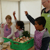 Dann ging es zum Einkaufen an den Marktstand des Berninghofs, der im Innenhof der Werburg auf die Kunden wartete. Das frische Gemüse und die duftenden Kräuter wurden per Handschlag bezahlt. Beim Gemüseschnippeln, Abwiegen der Zutaten und Kochen lernten die Kinder den Umgang mit spitzem, scharfem Werkzeug, heißem Wasserdampf und das Einstellen der Herdplatte.